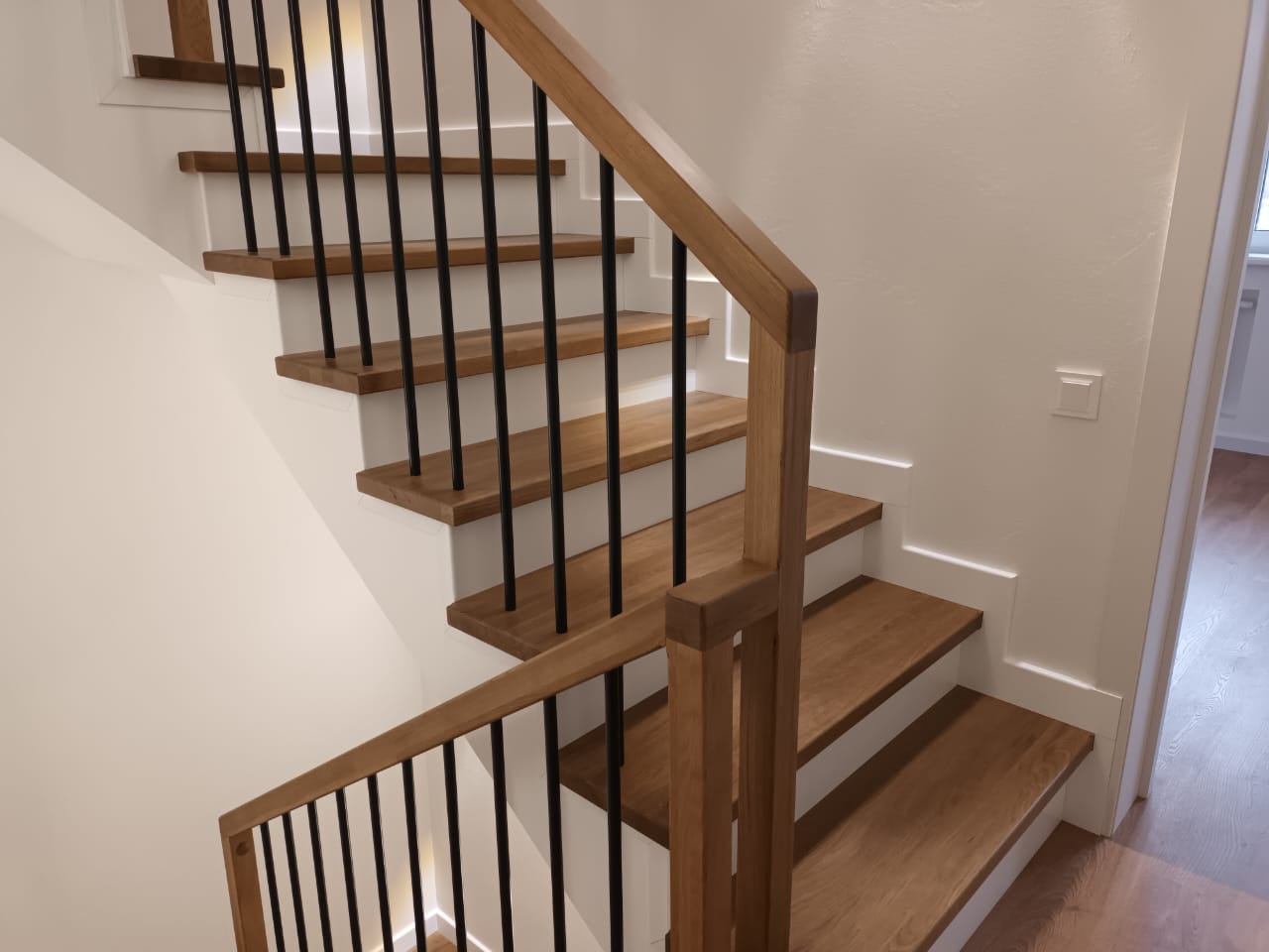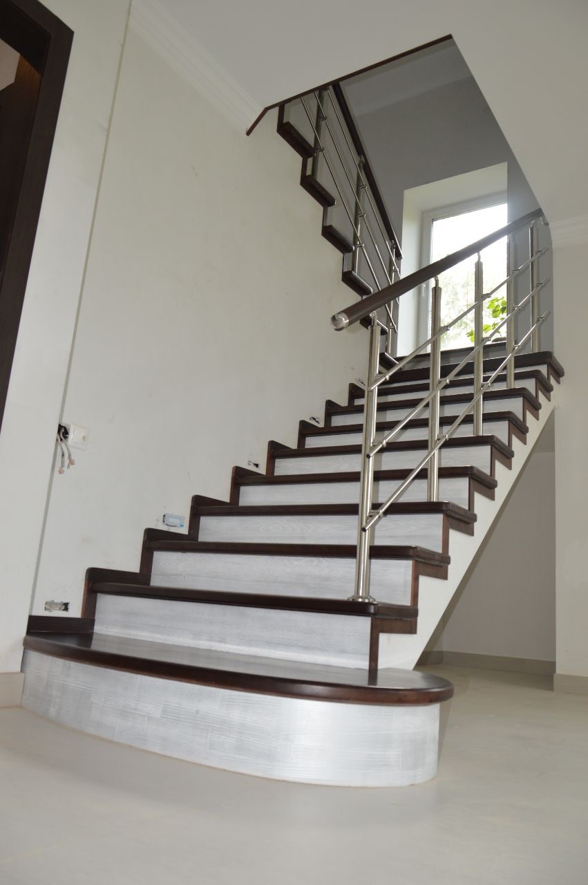 Для клиента из коттеджного посёлка мы облицевали бетонный каркас лестницы ступенями и подступенниками из дуба, установили плинтус вдоль стен. Проект отличался сложной конструкцией и нестандартными дизайнерскими решениями. Заказчик остался доволен результатом, лестницу отметили как эстетически привлекательный и надёжный элемент интерьера.