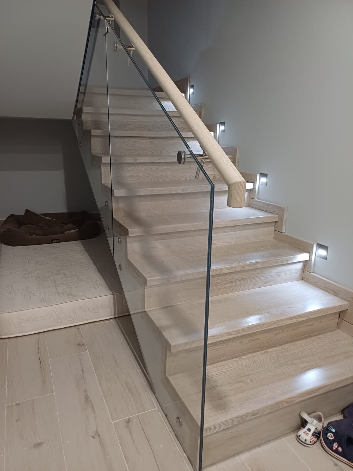 Для клиента мы изготовили и облицевали металлический каркас лестницы ступенями и подступенниками из дуба, установили плинтус вдоль стен. Подшили сбоку и снизу МДФ, выкрашенным в цвет стен. Установили ограждения из стекла с применением боквого крепежа. Стекло-триплекс 5+5 мм. Заказчик остался доволен результатом.